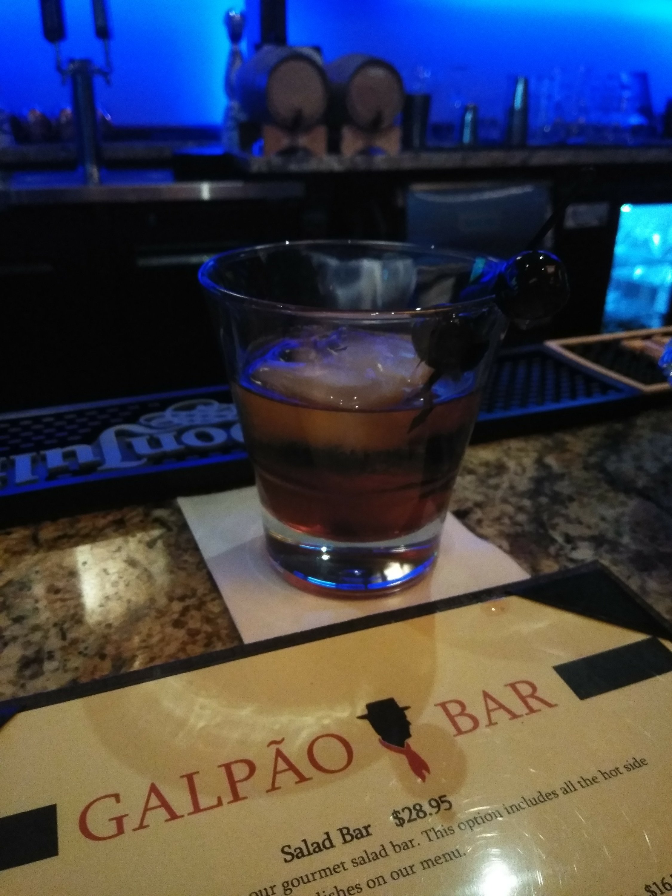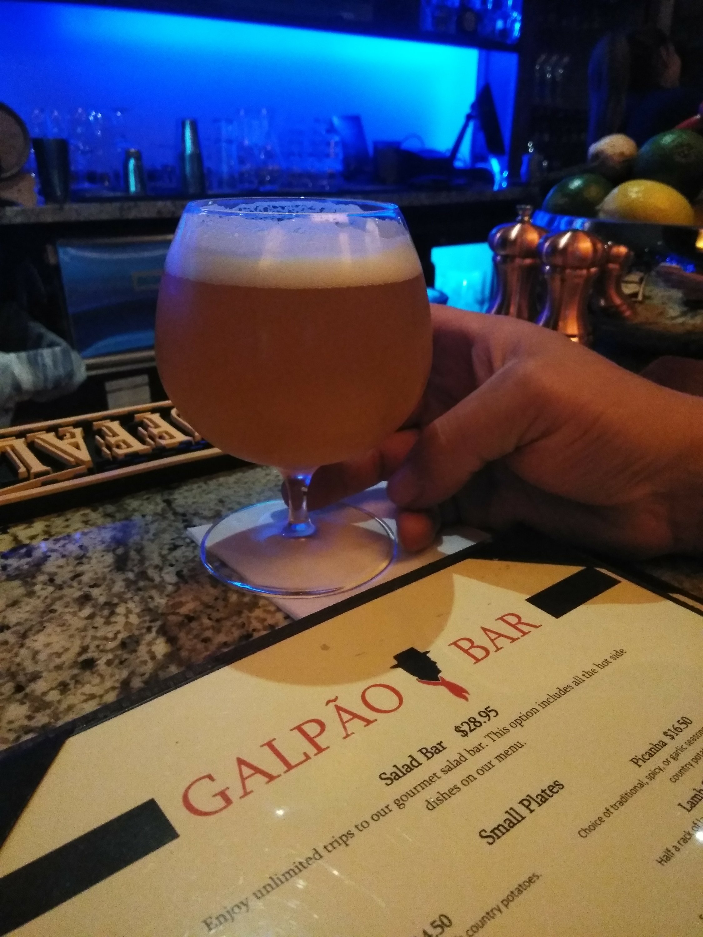 We drove rather aimlessly until we found ourselves at Galpao Gaucho Brazilian Steakhouse in Cupertino. The parking was packed and there were several groups standing outside -a good omen, in my opinion. Upon entering the salacious smells descended upon us and the ambiance likewise embraced us. Gentle lighting, subtle music and a warm greeting immediately welcomed our entry. The restaurant was buzzing, but the bar was wonderfully wide open.