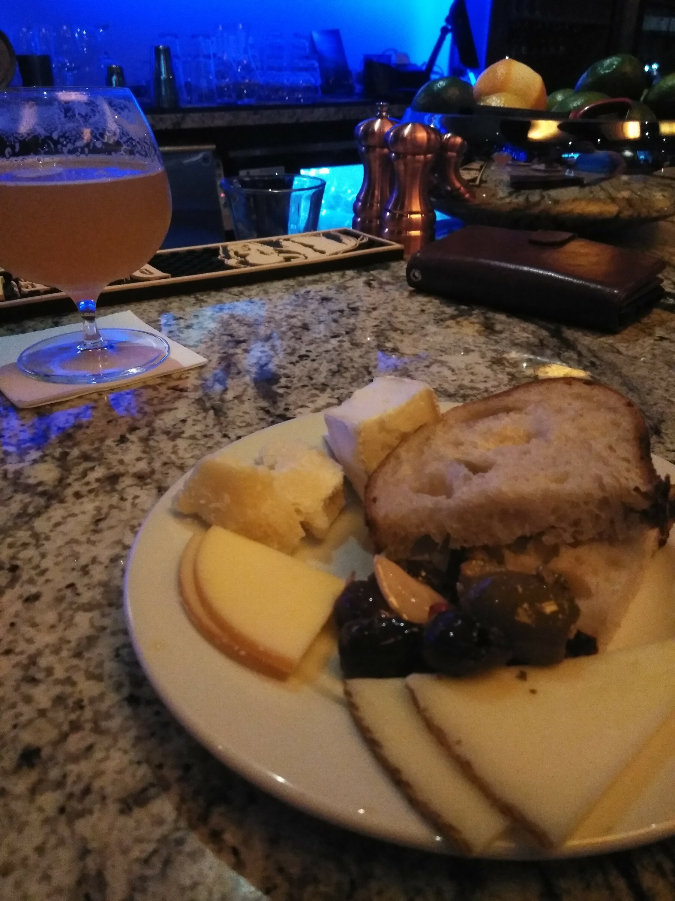 We weren’t out for the night and could only steal a moment, so the cheese assortment seemed the perfect accompaniment to our libations. Several cheeses, an olive medley and fresh crusty sourdough made a lovely snack as we peppered the bartender with questions about the establishment.